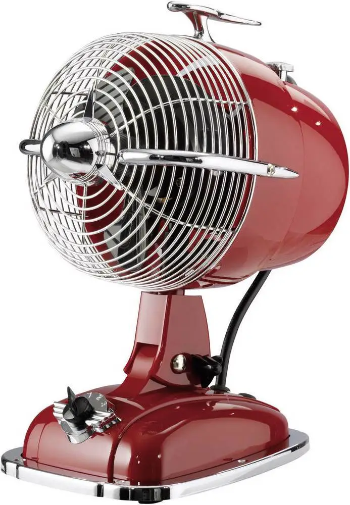 Oscillating table fan in iconic retro design with shiny chrome protective grille and applications. Provides comfortable and powerful cooling.
