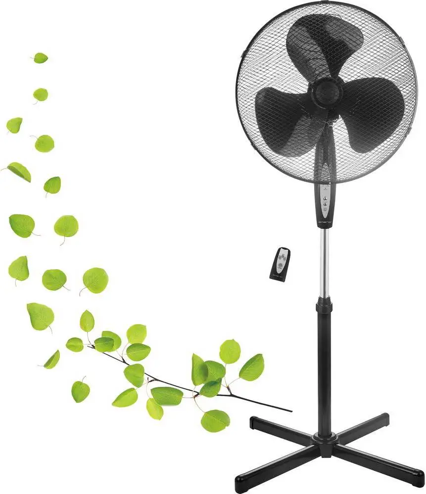 Stand fan 40 cm3 rotor blades3 speedsTiltable, height adjustableWith timer and remote controlTechnical data: Number of switching levels: 3 – Operating voltage: 230 V – Blade color: Black – Housing color: Black – Weight: 2.43 kg – Grille Ø: 40 cm – Power: 45 W – Product type: Pedestal fan – Product dimension, height: 125 cm – Fan features: Height adjustable,Oscillating,TimerNote: Please follow the operating instructions.2 x AA batteries for remote control not included.