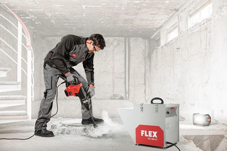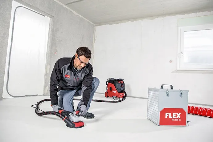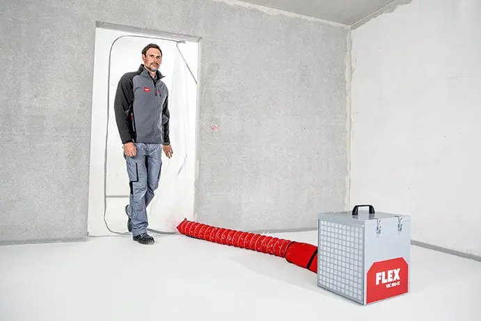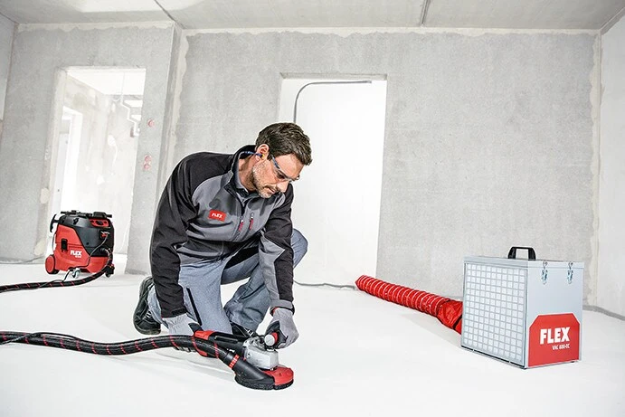 Dust is extracted directly at the point of origin. By installing mobile plastic walls and airlocks, a negative pressure can be achieved, thus preventing dust from spreading outside the working area.