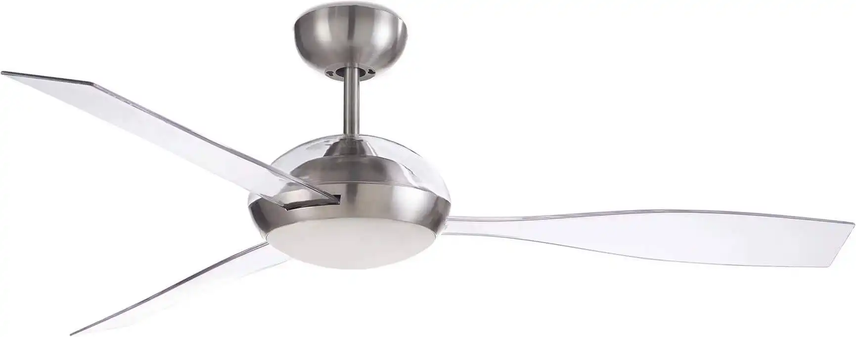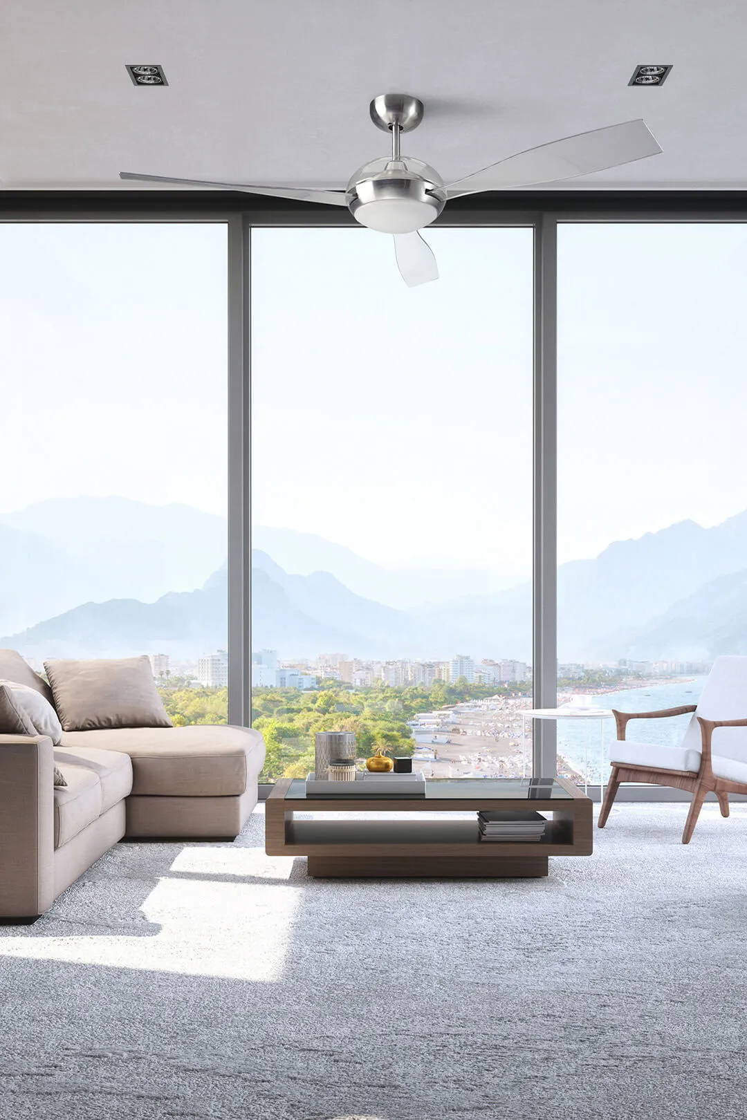 Dimensions and technical details 220-240 V ~ 50/60 Hz Diameter: 132cm / 52″ Housing colour: satin nickel, clear Blade colour: clear Integral lighting: 16 W LED (included in the delivery) Motor wattage: 7.5 / 12.4 / 20.3 / 31.2 / 50 W Revolutions per minute: 115 / 145 / 172 / 202 / 235 Max. airflow: 107.6 m3/min / 3800 cfm Max. noise level: 45 dB(A) Overall drop: 35.5cm / 14″ Diameter canopy: 15cm / 5.9″ Max. ceiling slope: 15° Forward and reverse function (summer and winter mode) Includes remote control: 5 fan speeds / off, light on / off, running direction Weight: 7.5kg / 16.5lbs Details LED Wattage: 16 W Colour temperature: 3000 K (warm white) Lumens: 1620 lm CRI: 80Service life: 36000 h Not dimmable The lamps cannot be changed in the luminaire.