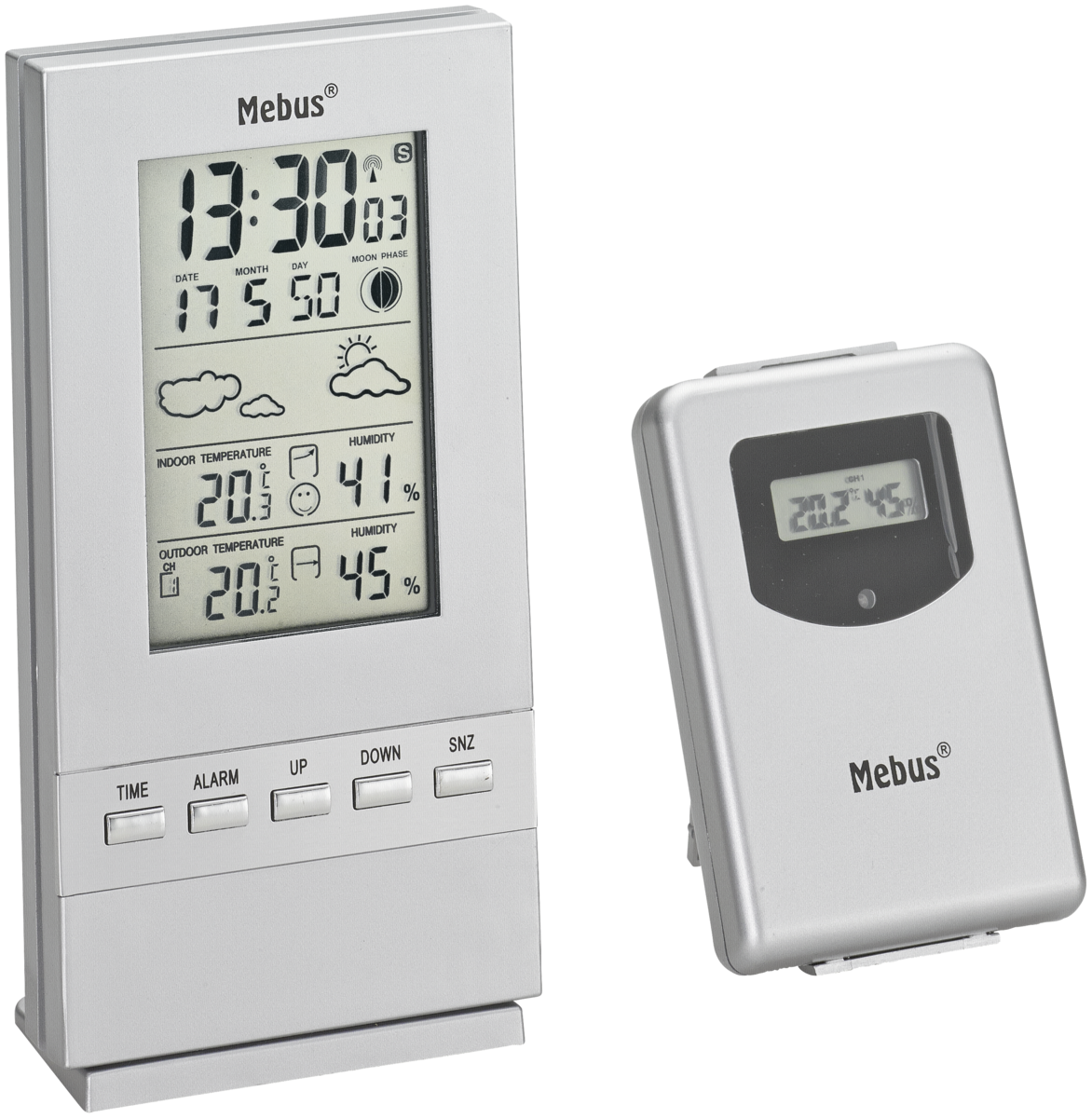 -Digital indoor/outdoor Thermometer digital indoor/outdoor Hygrometer trend display for temperature comfort zone indicator radio-controlled clock with 12/24 hours display time zone setting alarm clock with alarm repetition calendar (day, month, weekday) moon phase display 1 radio sensor included in the scope of supply can be used as a wall or table device color: silver-16.5 x 8.7 x 2.3 cm.