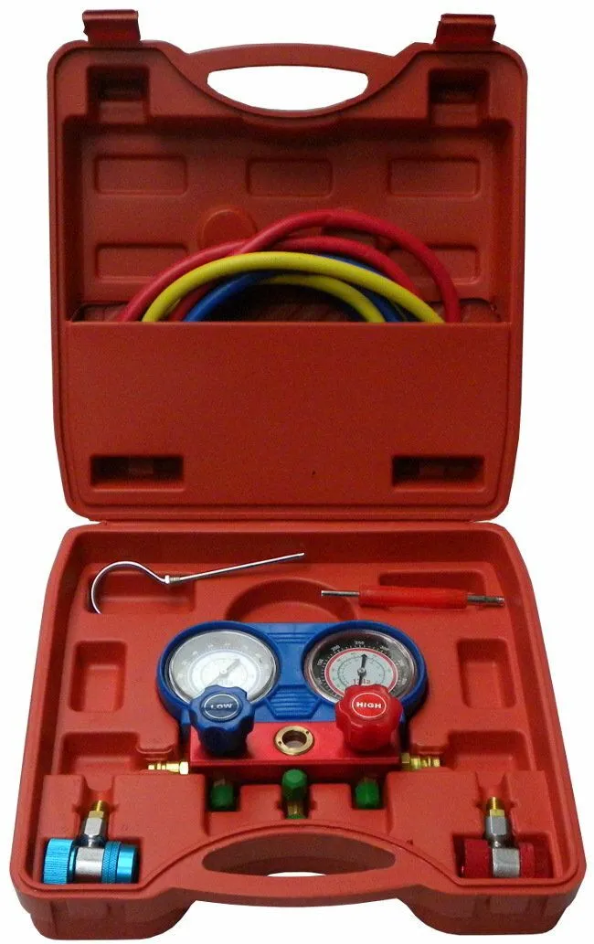 Professional kit for diagnosing and refilling the air conditioning system for handling refrigerant R-134a.