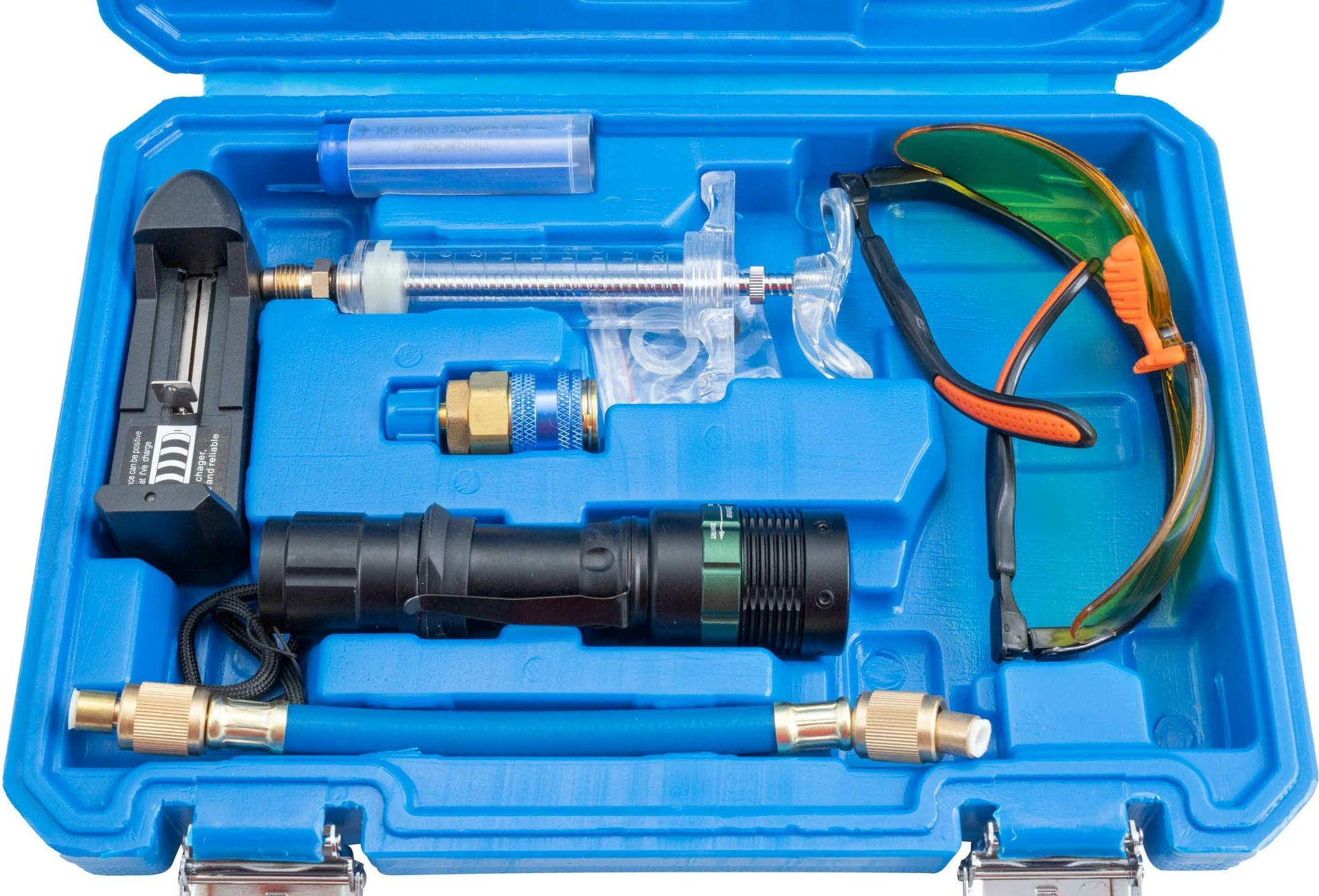 Quality tester, UV lamps for checking refrigerant leaks in air conditioning systems, for which the applicator with injector and coupling is used to fill in the air conditioning contrast medium.