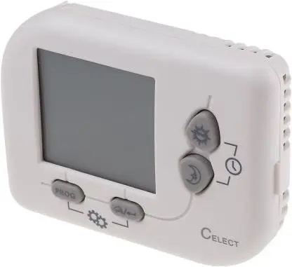 Wireless room thermostat with large LCD screen and backlight. Programmable wireless room thermostat, pre-wired for easy connection. Will replace most home thermostats and is designed for use with electric, gas, oil heating or cooling. The functions of this thermostat are divided into two units, the receiver and the controller. The receiver is used to connect the wiring and ON/OFF control for heat or cooling. The thermostat can be kept in any room or area up to 20m away. Digitally programmable 5+1+1 day RF room thermostat with 6 comfort/drop periods daily, i.e. morning, afternoon, evening and night. The time periods are pre-programmed but can be changed to suit your life patterns. Override option available, ideal for vacations etc. Large backlit LCD display and easy push button temperature adjustment (up and down), constant display of actual room temperature and set temperature. The transmitter and receiver have DIP switches for address selection. The receiver ignores messages sent by the transmitter with a different address. Frequency band: 868 MHz Temperature measurement 0.0 – 40 °C (0.1 °C/step) Room temperature setting range 5 °C ∼ 35 °C accuracy + 0.5 °C Receiver input voltage 240 V ac, 50 Hz Receiver – output voltage 24 -240 V ac, 50/60 Hz, 10 (3)A max. Operating temperature: 0 °C to 50 °C Storage temperature -10 to 60 °C Terminals 2.5 mm2 cable Sensor element NTC thermistor LCD screen backlight Electronic control Type 2.B Action Transmitter/Battery 2 x 1.5 V AAA- alkaline manganese battery (not included) Color: White.