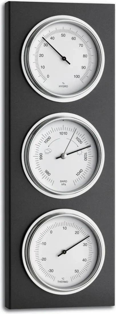 This quality weather station consists of an anthracite-coated metal base plate in an attractive design. The three large quality measuring mechanisms for humidity, air pressure and temperature are embedded in it. The device is absolutely rust-free and is not only used for weather observation, but also as a valuable decoration piece for your apartment, entrance area, balcony or conservatory. A beautiful, extra large station for indoor and outdoor use.