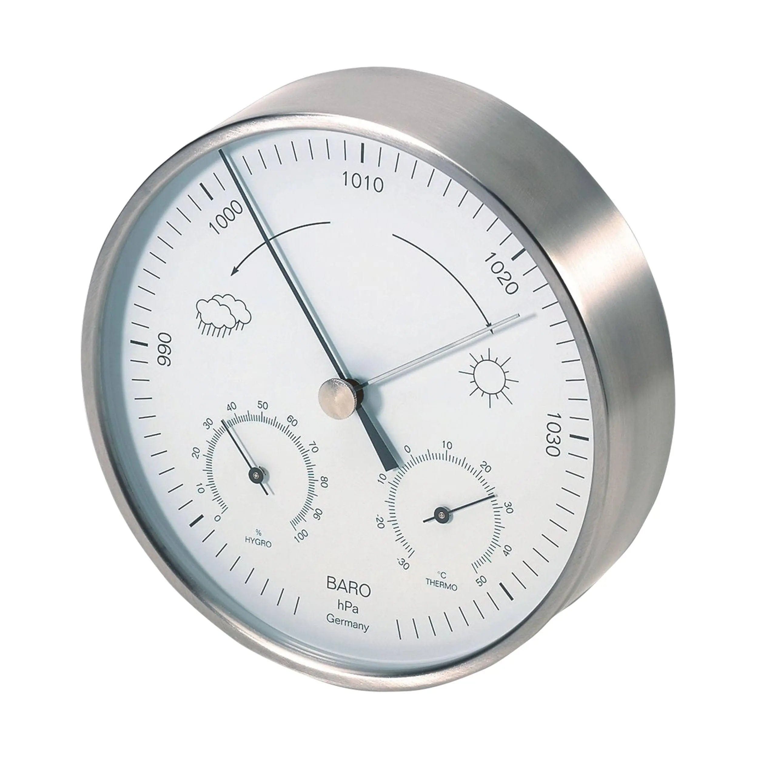 Baro Analog Weather Station. The most important parameters at a glance: TFA Dostmann puts the information about the weather decoratively descriptive in timeless analog precision engineering. On a white background easily readable as a circle on the large analog scale presents the barometer with its typical weather graphics of a rain cloud as “low” and a sun as “high”. A so-called drag pointer can be used to mark an air pressure measurement by means of the small wheel in the center of the circular display: Easily adjusted, this drag pointer marker can be read at a glance with the current air pressure the next morning and a weather tendency can be quickly created by yourself. Below the barometer display TFA Dostmann arranges two smaller round scales: The thermometer shows the current temperature in degrees Celsius, the hygrometer the relative humidity. The round stainless steel housing of the Baro Analog Weather Station can be placed both indoors and outdoors.