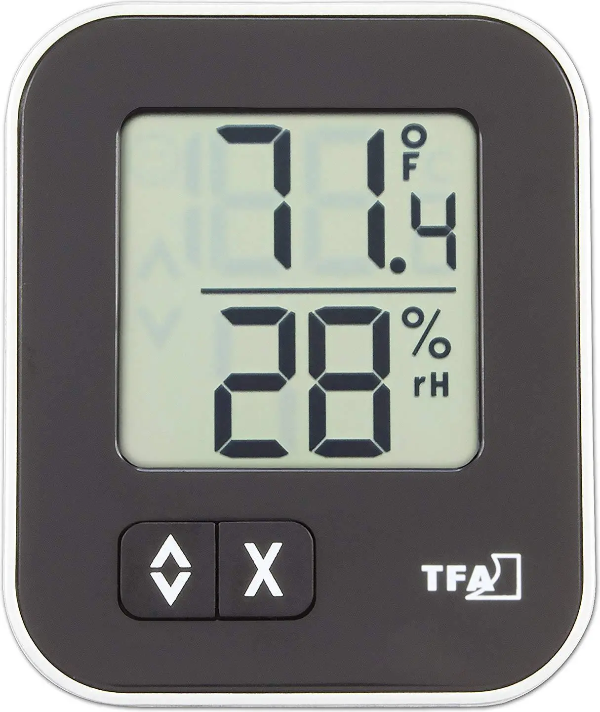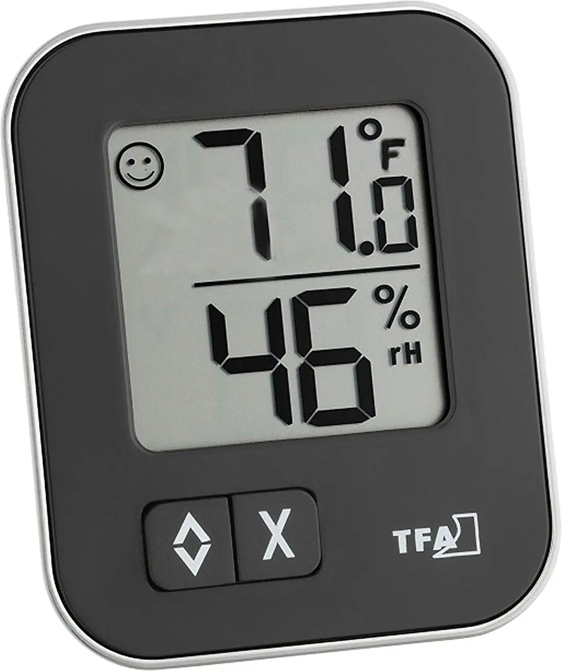 The Moxx measures temperature and humidity and displays them in approx. 20 mm numbers. A laughing face indicates the comfort level if the room climate is in the ideal range of 40 – 60 %. The device stores minimum and maximum values. The memory can be reset manually. Too high or too low humidity can have a negative effect on human health. With this device you know if your indoor air has the right mixture.