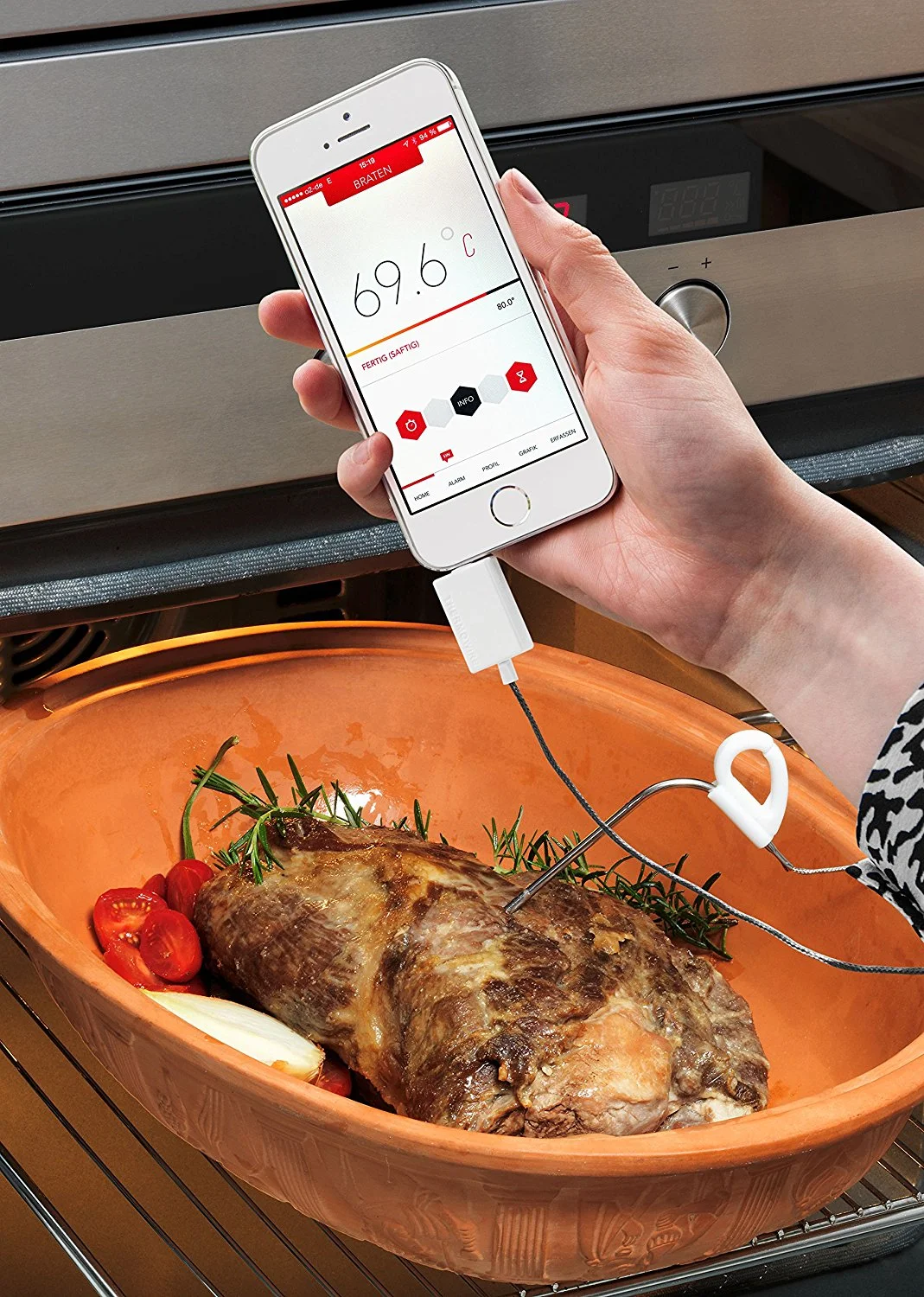 Find out the secret of how roasts, steaks and other dishes always turn out perfectly: Monitor the core temperature! The Thermowire App now informs you when the right temperature is reached and your dish is cooked to perfection. Download the free Thermowire App to your smartphone, plug the Thermowire sensor into the headphone socket and you’re ready to go. Use the pre-programmed cooking profiles or enter an individual temperature setting. When the target temperature is reached, an alarm signal sounds. The app also offers a timer and stopwatch function. With the graphical evaluation you can follow the cooking process in detail and if you find a dish particularly successful, take a photo of it and share it with your friends on Facebook or Twitter.