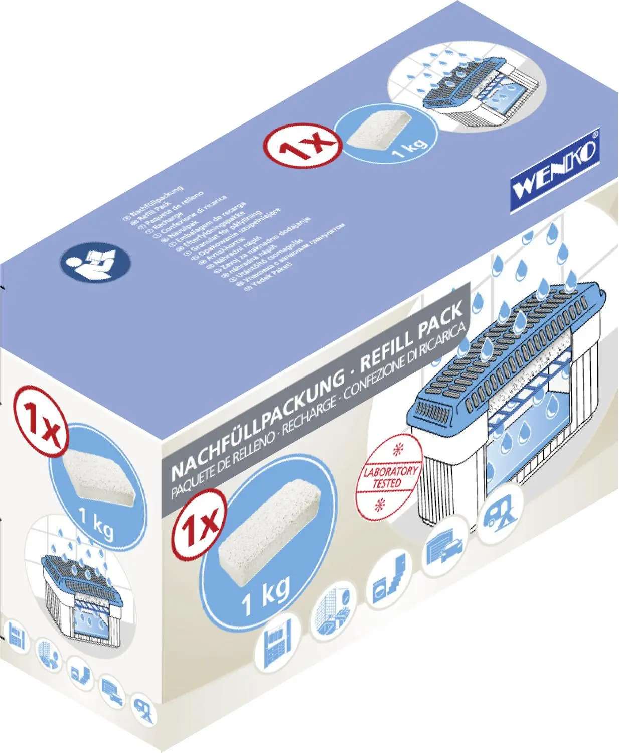 In an environmentally friendly way, it protects walls, furniture, textiles or the car from moisture, mould and unpleasant odours with the dehumidification process that starts immediately.1 kg refiller of the drying granulate for the 1 kg moisture killer is sufficient for approx. 4-6 months in rooms up to 80 m³.The ingredients behave biologically-chemically similar to natural drying agents such as sea salt.