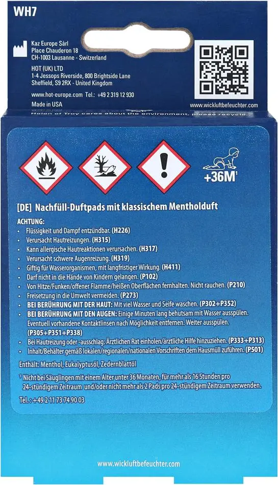 Hazard and safety information:-(H226) Flammable liquid and vapour-(H315) Causes skin irritation-(H317) May cause allergic skin reactions-(H319) Causes severe eye irritation-(H411) Toxic to aquatic organisms with long-term effects-(P102) Keep out of the reach of children-(P210) Keep away from heat/ sparks/ open flames/hot surfaces. Do not smoke-(P273) Avoid release into the environment-(P302 + P352) In case of contact with skin: wash with plenty of soap and water-(P305 + P351 + P3) In case of contact with eyes: rinse gently with water for a few minutes Remove any contact lenses if possible. (P333 + P313) In case of skin irritation or rash: seek medical advice/attention. Do not use on infants under 3 months of age or weighing less than 4.5 kg, for more than 16 hours per 24-hour period and/or no more than 2 pads per 24-hour period.